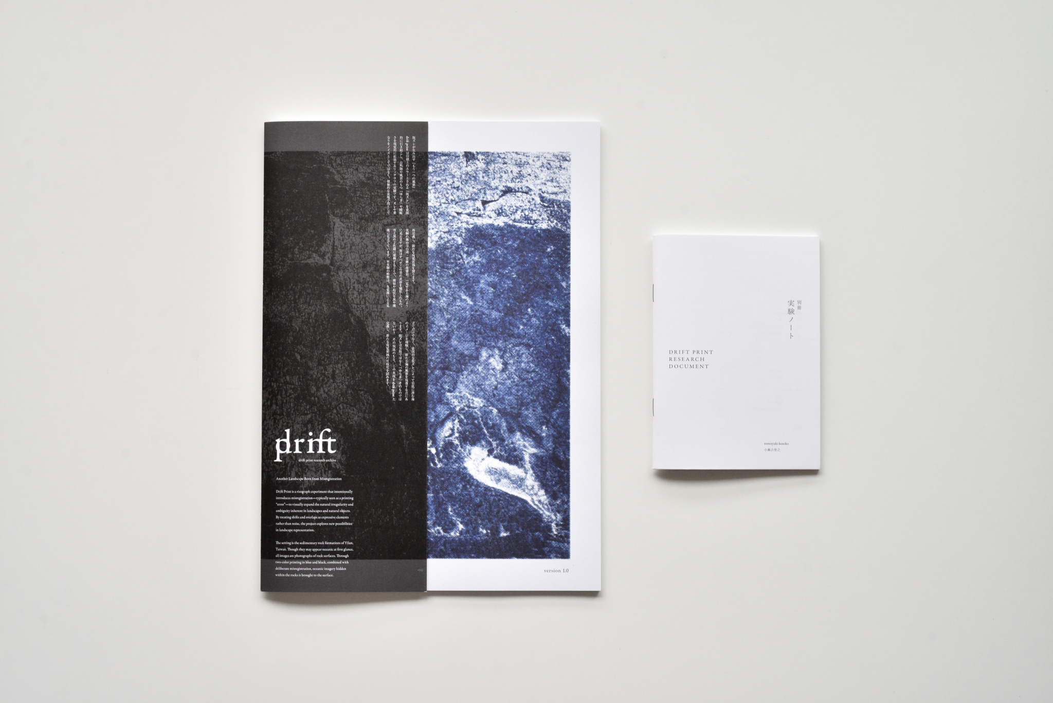 台湾・宜蘭地域の風景を、常識とは異なる視点でレンダリングし、地域に対する新たな目線をデザインするプロジェクト。一見すると海のアートブックに見えますが、これらはすべて宜蘭の地質写真。宜蘭海岸に点在する堆積岩の岩肌を被写体とした、青と黒のリソグラフ2色刷による「海の風景に擬態する堆積岩」の作品群を収録した。また、リソグラフの版ズレによって、波のゆらぎや奥行きが生まれることから、この印刷手法を「drift-print」と定義した。